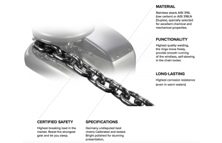 Windlass Anchor Chains CXA/CXI, Grade 60 PLUS (AISI 318 LN Duplex), CROMOX, measures acc. to DIN 766 and ISO 4565, tested, calibrated, bright polished